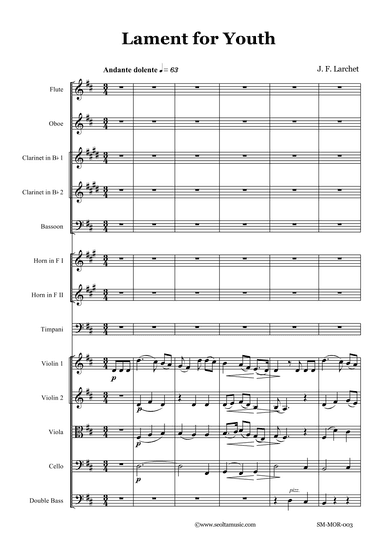 Full Orchestra - Level 4 - Digital Download SKU: A0.1298470 Composed by J. F. Larchet. 20th Century,Celtic,Irish,Traditional. 31 pages. Seolta Music Limited #888442. Published by Seolta Music Limited (A0.1298470). Lament for Youth is a beautiful Irish arrangement by J.F. Larchet, one of Ireland's most celebrated composers. The piece starts with a slow air entitled 'My Gentle Harp' followed by a lively dance tune 'The Galway Reel'. Larchet combines these two tunes with great artistry in a rousing final section. For more orchestral pieces from Seolta Publishing please click here. This product was created by a member of ArrangeMe, Hal Leonard's global self-publishing community of independent composers, arrangers, and songwriters. ArrangeMe allows for the publication of unique arrangements of popular titles and original compositions from a variety of voices and backgrounds. The length, difficulty, and retail pricing are determined solely by the discretion of the person who arranged or composed it. About Digital Downloads Digital Downloads are downloadable sheet music files that can be viewed directly on your computer, tablet or mobile device. Once you download your digital sheet music, you can view and print it at home, school, or anywhere you want to make music, and you don’t have to be connected to the internet. Just purchase, download and play! PLEASE NOTE: Your Digital Download will have a watermark at the bottom of each page that will include your name, purchase date and number of copies purchased. You are only authorized to print the number of copies that you have purchased. You may not digitally distribute or print more copies than purchased for use (i.e., you may not print or digitally distribute individual copies to friends or students).