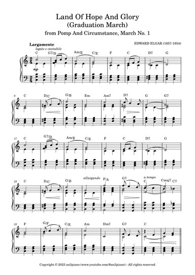 Easy Piano - Level 3 - Digital Download SKU: A0.1267716 Composed by Edward Elgar. Arranged by an3ss piano. Classical,March,Patriotic. Score. 2 pages. Andrés Moreno #860256. Published by Andrés Moreno (A0.1267716). Intermediate level arrangement in C major of the Trio from Pomp and Circumstance, March No.1. The "Molto Maestoso" section can be repeated ad libitum so it can accompany a graduation or other ceremony for as long as required. This product was created by a member of ArrangeMe, Hal Leonard’s global self-publishing community of independent composers, arrangers, and songwriters. ArrangeMe allows for the publication of unique arrangements of both popular titles and original compositions from a wide variety of voices and backgrounds. About Digital Downloads Digital Downloads are downloadable sheet music files that can be viewed directly on your computer, tablet or mobile device. Once you download your digital sheet music, you can view and print it at home, school, or anywhere you want to make music, and you don’t have to be connected to the internet. Just purchase, download and play! PLEASE NOTE: Your Digital Download will have a watermark at the bottom of each page that will include your name, purchase date and number of copies purchased. You are only authorized to print the number of copies that you have purchased. You may not digitally distribute or print more copies than purchased for use (i.e., you may not print or digitally distribute individual copies to friends or students).