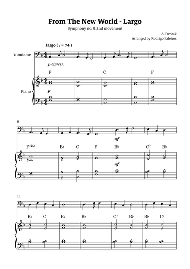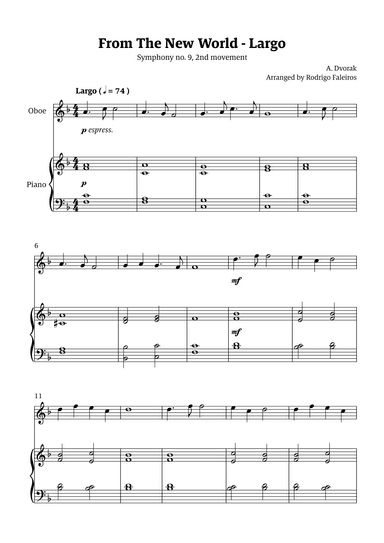 B-Flat Clarinet Solo - Level 1 - Digital Download SKU: A0.1275456 Composed by Antonin Dvorak. Arranged by Rodrigo Faleiros. 19th Century,Chamber,Christmas,Romantic Period,Wedding. Individual part. 1 pages. Rodrigo Faleiros #867247. Published by Rodrigo Faleiros (A0.1275456). Step into a world of musical enchantment with this adaptation of the Largo, 2nd movement from Antonin Dvorak's Symphony no. 9, "From the New World." Designed for an easy solo clarinet in Bb with chord symbols for another musician to play along, this rendition has been carefully tailored to embrace aspiring musicians and create an intimate ambiance, making it a perfect choice for students, weddings, graduations and other special gatherings. The arrangement is transposed to the key of F major, ensuring ease for beginners, allowing them to delve into the soulful melodies effortlessly. This product was created by a member of ArrangeMe, Hal Leonard’s global self-publishing community of independent composers, arrangers, and songwriters. ArrangeMe allows for the publication of unique arrangements of both popular titles and original compositions from a wide variety of voices and backgrounds. About Digital Downloads Digital Downloads are downloadable sheet music files that can be viewed directly on your computer, tablet or mobile device. Once you download your digital sheet music, you can view and print it at home, school, or anywhere you want to make music, and you don’t have to be connected to the internet. Just purchase, download and play! PLEASE NOTE: Your Digital Download will have a watermark at the bottom of each page that will include your name, purchase date and number of copies purchased. You are only authorized to print the number of copies that you have purchased. You may not digitally distribute or print more copies than purchased for use (i.e., you may not print or digitally distribute individual copies to friends or students).
