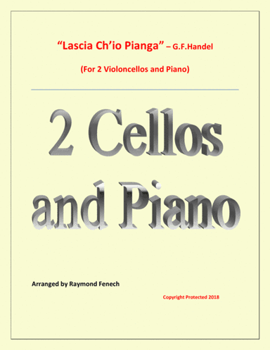 Cello Duet Cello - Level 3 - Digital Download SKU: A0.760008 Composed by George Frideric Handel. Arranged by Raymond Fenech. Baroque,Easter,Instructional,Praise & Worship,Standards. Score. 19 pages. Raymond Fenech #3480639. Published by Raymond Fenech (A0.760008). Lascia ch’io pianga, originally Lascia la spina, cogli la rosa, is an Italian-language soprano aria by composer George Frideric Handel that has become a popular concert piece. Its melody is first found in Act III of Handel’s 1705 opera Almira as a sarabande. This aria is arranged for 2 Violoncellos and Piano . The Duration is approx. 4 minutes and the level is Advanced Intermediate. This product was created by a member of ArrangeMe, Hal Leonard's global self-publishing community of independent composers, arrangers, and songwriters. ArrangeMe allows for the publication of unique arrangements of popular titles and original compositions from a variety of voices and backgrounds. The length, difficulty, and retail pricing are determined solely by the discretion of the person who arranged or composed it. About Digital Downloads Digital Downloads are downloadable sheet music files that can be viewed directly on your computer, tablet or mobile device. Once you download your digital sheet music, you can view and print it at home, school, or anywhere you want to make music, and you don’t have to be connected to the internet. Just purchase, download and play! PLEASE NOTE: Your Digital Download will have a watermark at the bottom of each page that will include your name, purchase date and number of copies purchased. You are only authorized to print the number of copies that you have purchased. You may not digitally distribute or print more copies than purchased for use (i.e., you may not print or digitally distribute individual copies to friends or students).