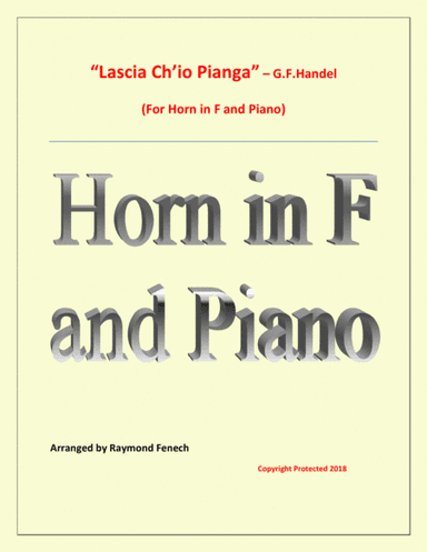 Chamber Orchestra French Horn,Piano - Level 4 - Digital Download SKU: A0.759977 Composed by George Frideric Handel. Arranged by Raymond Fenech. Baroque,Christmas,Easter,Instructional,Praise & Worship. Score and part. 16 pages. Raymond Fenech #3478111. Published by Raymond Fenech (A0.759977). Lascia ch’io pianga, originally Lascia la spina, cogli la rosa, is an Italian-language soprano aria by composer George Frideric Handel that has become a popular concert piece. Its melody is first found in Act III of Handel’s 1705 opera Almira as a sarabande. This aria is arranged for Horn in F and Piano . The Duration is approx. 4 minutes and the level is Advanced Intermediate. This product was created by a member of ArrangeMe, Hal Leonard’s global self-publishing community of independent composers, arrangers, and songwriters. ArrangeMe allows for the publication of unique arrangements of both popular titles and original compositions from a wide variety of voices and backgrounds. About Digital Downloads Digital Downloads are downloadable sheet music files that can be viewed directly on your computer, tablet or mobile device. Once you download your digital sheet music, you can view and print it at home, school, or anywhere you want to make music, and you don’t have to be connected to the internet. Just purchase, download and play! PLEASE NOTE: Your Digital Download will have a watermark at the bottom of each page that will include your name, purchase date and number of copies purchased. You are only authorized to print the number of copies that you have purchased. You may not digitally distribute or print more copies than purchased for use (i.e., you may not print or digitally distribute individual copies to friends or students).