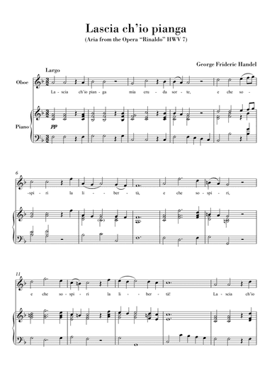 Small Ensemble Oboe,Piano - Level 2 - Digital Download SKU: A0.777563 Composed by George Frideric Handel. Arranged by Ahiva Editions. Baroque,Wedding. Score and part. 4 pages. Ahiva Editions #6362179. Published by Ahiva Editions (A0.777563). Lascia ch'io pianga (for Violin and Piano) Original Key F majorAria from the Opera Rinaldo HWV 7Includes the solo part with the text (lyrics)Very clear professional engraving. This product was created by a member of ArrangeMe, Hal Leonard’s global self-publishing community of independent composers, arrangers, and songwriters. ArrangeMe allows for the publication of unique arrangements of both popular titles and original compositions from a wide variety of voices and backgrounds. About Digital Downloads Digital Downloads are downloadable sheet music files that can be viewed directly on your computer, tablet or mobile device. Once you download your digital sheet music, you can view and print it at home, school, or anywhere you want to make music, and you don’t have to be connected to the internet. Just purchase, download and play! PLEASE NOTE: Your Digital Download will have a watermark at the bottom of each page that will include your name, purchase date and number of copies purchased. You are only authorized to print the number of copies that you have purchased. You may not digitally distribute or print more copies than purchased for use (i.e., you may not print or digitally distribute individual copies to friends or students).
