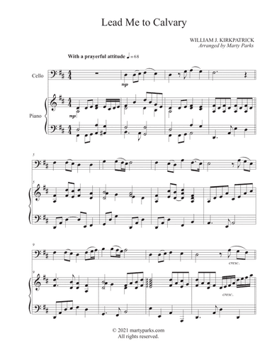 Cello,Piano - Level 3 - Digital Download SKU: A0.795008 Composed by William J. Kirkpatrick. Arranged by Marty Parks. Christian,Easter,Sacred. Score and part. 7 pages. Martyparks.com #6287489. Published by martyparks.com (A0.795008). Here's a beloved hymn of commitment and dedication, arranged for Cello and Piano. Especially appropriate for Lenten worship services, or for any gathering that emphasizes the cross of Christ. Intermediate difficulty level. (Full score and separate Cello part included.). This product was created by a member of ArrangeMe, Hal Leonard’s global self-publishing community of independent composers, arrangers, and songwriters. ArrangeMe allows for the publication of unique arrangements of both popular titles and original compositions from a wide variety of voices and backgrounds. About Digital Downloads Digital Downloads are downloadable sheet music files that can be viewed directly on your computer, tablet or mobile device. Once you download your digital sheet music, you can view and print it at home, school, or anywhere you want to make music, and you don’t have to be connected to the internet. Just purchase, download and play! PLEASE NOTE: Your Digital Download will have a watermark at the bottom of each page that will include your name, purchase date and number of copies purchased. You are only authorized to print the number of copies that you have purchased. You may not digitally distribute or print more copies than purchased for use (i.e., you may not print or digitally distribute individual copies to friends or students).