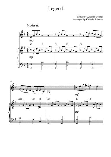 Clarinet,Piano - Level 3 - Digital Download SKU: A0.641181 Composed by Antonin Dvorak. Arranged by Kaiserin Rebecca. Concert,Instructional,Romantic Period,Standards. Score and part. 2 pages. Kaiserin Rebecca #5043747. Published by Kaiserin Rebecca (A0.641181). For clarinet in A solo and piano accompaniment with chords.Key: G majorDuration: 0'38 This product was created by a member of ArrangeMe, Hal Leonard's global self-publishing community of independent composers, arrangers, and songwriters. ArrangeMe allows for the publication of unique arrangements of popular titles and original compositions from a variety of voices and backgrounds. The length, difficulty, and retail pricing are determined solely by the discretion of the person who arranged or composed it. About Digital Downloads Digital Downloads are downloadable sheet music files that can be viewed directly on your computer, tablet or mobile device. Once you download your digital sheet music, you can view and print it at home, school, or anywhere you want to make music, and you don’t have to be connected to the internet. Just purchase, download and play! PLEASE NOTE: Your Digital Download will have a watermark at the bottom of each page that will include your name, purchase date and number of copies purchased. You are only authorized to print the number of copies that you have purchased. You may not digitally distribute or print more copies than purchased for use (i.e., you may not print or digitally distribute individual copies to friends or students).