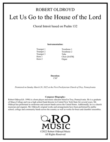 Large Ensemble B-Flat Trumpet,Choir,Horn,Organ,Trombone,Tuba - Level 2 - Digital Download SKU: A0.961941 Composed by Robert B. Oldroyd. Classical,Sacred,Traditional. Score and parts. 23 pages. Robert Oldroyd Music #567660. Published by Robert Oldroyd Music (A0.961941). Composed as the Choral Introit for the Bicentennial Service of the First Presbyterian Church of Troy, Pennsylvania, "Let Us Go to the House of the Lord," is written for Brass Octet (3 trpts, 2hns, 2 trbs, tuba), organ, and SATB choir. It is based on Psalm 132. This product was created by a member of ArrangeMe, Hal Leonard’s global self-publishing community of independent composers, arrangers, and songwriters. ArrangeMe allows for the publication of unique arrangements of both popular titles and original compositions from a wide variety of voices and backgrounds. About Digital Downloads Digital Downloads are downloadable sheet music files that can be viewed directly on your computer, tablet or mobile device. Once you download your digital sheet music, you can view and print it at home, school, or anywhere you want to make music, and you don’t have to be connected to the internet. Just purchase, download and play! PLEASE NOTE: Your Digital Download will have a watermark at the bottom of each page that will include your name, purchase date and number of copies purchased. You are only authorized to print the number of copies that you have purchased. You may not digitally distribute or print more copies than purchased for use (i.e., you may not print or digitally distribute individual copies to friends or students).