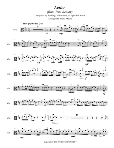 Viola Solo - Level 2 - Digital Download SKU: A0.958260 Composed by Hyun Bin Kwon, Millennium, and Sihwang. Arranged by Diana Mayne. Pop. Individual part. 2 pages. Diana Mayne #6492415. Published by Diana Mayne (A0.958260). Viola sheet music for the song "Letter" by VIINI, also known as Seojun's debut single from the Webtoon True Beauty by Yaongyi.  This sheet music is for the melody of the song (does not include the piano part), and can be played along with the original version for fun.  The notes are all in first position, all in alto clef, and all in the key of D major.  The pop rhythms are a little tricky to read, but if you play along with the original song, the rhythms won't be hard to figure out. This product was created by a member of ArrangeMe, Hal Leonard's global self-publishing community of independent composers, arrangers, and songwriters. ArrangeMe allows for the publication of unique arrangements of popular titles and original compositions from a variety of voices and backgrounds. The length, difficulty, and retail pricing are determined solely by the discretion of the person who arranged or composed it. About Digital Downloads Digital Downloads are downloadable sheet music files that can be viewed directly on your computer, tablet or mobile device. Once you download your digital sheet music, you can view and print it at home, school, or anywhere you want to make music, and you don’t have to be connected to the internet. Just purchase, download and play! PLEASE NOTE: Your Digital Download will have a watermark at the bottom of each page that will include your name, purchase date and number of copies purchased. You are only authorized to print the number of copies that you have purchased. You may not digitally distribute or print more copies than purchased for use (i.e., you may not print or digitally distribute individual copies to friends or students).
