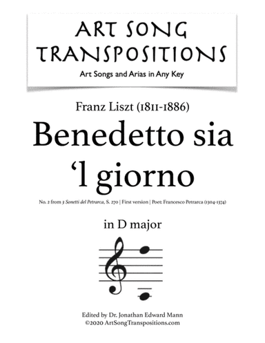 Piano,Vocal,Voice - Digital Download SKU: A0.539539 Composed by Franz Liszt. Arranged by ArtSongTranspositions.com. Romantic Period. Score. 7 pages. AST Publications, LLC #6035675. Published by AST Publications, LLC (A0.539539). ⇨ PAY $0.00 with INSTITUTIONAL MEMBERSHIP✓ 10,000+ art songs and Baroque aria PDFs✓ Transpose sheet music to any key✓ Free for faculty, students, staff, and employees✓ Campus-wide access via IP authentication✓ Off-campus access via EZproxy or SAML This product was created by a member of ArrangeMe, Hal Leonard's global self-publishing community of independent composers, arrangers, and songwriters. ArrangeMe allows for the publication of unique arrangements of popular titles and original compositions from a variety of voices and backgrounds. The length, difficulty, and retail pricing are determined solely by the discretion of the person who arranged or composed it. About Digital Downloads Digital Downloads are downloadable sheet music files that can be viewed directly on your computer, tablet or mobile device. Once you download your digital sheet music, you can view and print it at home, school, or anywhere you want to make music, and you don’t have to be connected to the internet. Just purchase, download and play! PLEASE NOTE: Your Digital Download will have a watermark at the bottom of each page that will include your name, purchase date and number of copies purchased. You are only authorized to print the number of copies that you have purchased. You may not digitally distribute or print more copies than purchased for use (i.e., you may not print or digitally distribute individual copies to friends or students).