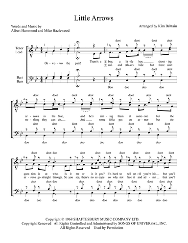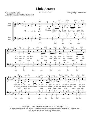 Choral Choir (SSAA) - Level 2 - Digital Download SKU: A0.1151372 By Leapy Lee. By Albert Hammond and Mike Hazelwood. Arranged by Kim Brittain. A Cappella,Barbershop,Contemporary,Pop. Octavo. 3 pages. HKB Music #751559. Published by HKB Music (A0.1151372). Originally recorded by Leapy Lee, this 4-part women's arrangement makes for a peppy and fun Valentine serenade or anytime showpiece. The catchy tune will linger in the ear. This product was created by a member of ArrangeMe, Hal Leonard’s global self-publishing community of independent composers, arrangers, and songwriters. ArrangeMe allows for the publication of unique arrangements of both popular titles and original compositions from a wide variety of voices and backgrounds. About Digital Downloads Digital Downloads are downloadable sheet music files that can be viewed directly on your computer, tablet or mobile device. Once you download your digital sheet music, you can view and print it at home, school, or anywhere you want to make music, and you don’t have to be connected to the internet. Just purchase, download and play! PLEASE NOTE: Your Digital Download will have a watermark at the bottom of each page that will include your name, purchase date and number of copies purchased. You are only authorized to print the number of copies that you have purchased. You may not digitally distribute or print more copies than purchased for use (i.e., you may not print or digitally distribute individual copies to friends or students).