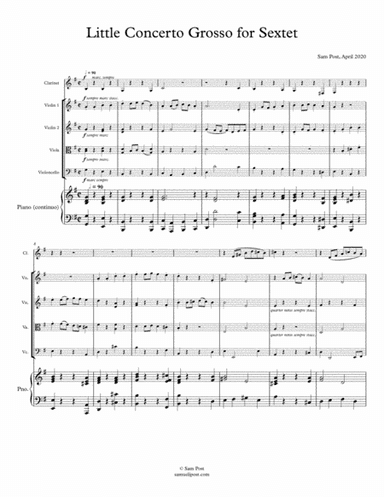 Small Ensemble,Strings Clarinet,Piano - Digital Download SKU: A0.947064 Composed by Sam Post. Baroque,Contemporary. Score and parts. 17 pages. Sam Post, composer/pianist #5989349. Published by Sam Post, composer/pianist (A0.947064). A little Baroque-style sextet with clarinet, string quartet, and piano (continuo). . This product was created by a member of ArrangeMe, Hal Leonard's global self-publishing community of independent composers, arrangers, and songwriters. ArrangeMe allows for the publication of unique arrangements of popular titles and original compositions from a variety of voices and backgrounds. The length, difficulty, and retail pricing are determined solely by the discretion of the person who arranged or composed it. About Digital Downloads Digital Downloads are downloadable sheet music files that can be viewed directly on your computer, tablet or mobile device. Once you download your digital sheet music, you can view and print it at home, school, or anywhere you want to make music, and you don’t have to be connected to the internet. Just purchase, download and play! PLEASE NOTE: Your Digital Download will have a watermark at the bottom of each page that will include your name, purchase date and number of copies purchased. You are only authorized to print the number of copies that you have purchased. You may not digitally distribute or print more copies than purchased for use (i.e., you may not print or digitally distribute individual copies to friends or students).
