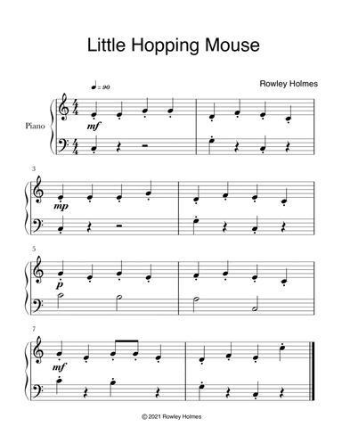 Easy Piano - Level 1 - Digital Download SKU: A0.1023781 Composed by Rowley Holmes. Children,Contemporary,Instructional. Score. 1 pages. Rowley Holmes #6436489. Published by Rowley Holmes (A0.1023781). The Little Hopping Mouse is a native Australian mouse. They live in the Australian bush and in the desert. They have big ears and a long tail. Instead of running, the mouse hops with its long back legs.  Play slowly through the right hand and choose the fingers you like the best. When you have done this, try the left hand. You can practice playing each hand and then play along with someone else playing the other hand. You can play staccato fingers and imagine the mouse hopping around. This product was created by a member of ArrangeMe, Hal Leonard’s global self-publishing community of independent composers, arrangers, and songwriters. ArrangeMe allows for the publication of unique arrangements of both popular titles and original compositions from a wide variety of voices and backgrounds. About Digital Downloads Digital Downloads are downloadable sheet music files that can be viewed directly on your computer, tablet or mobile device. Once you download your digital sheet music, you can view and print it at home, school, or anywhere you want to make music, and you don’t have to be connected to the internet. Just purchase, download and play! PLEASE NOTE: Your Digital Download will have a watermark at the bottom of each page that will include your name, purchase date and number of copies purchased. You are only authorized to print the number of copies that you have purchased. You may not digitally distribute or print more copies than purchased for use (i.e., you may not print or digitally distribute individual copies to friends or students).