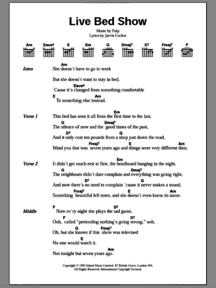 Digital sheet music for guitar (chords)NOTE: guitar chords only, lyrics and melody may be included (please, check the first page above before to buy this item to see what's included)Publisher: Hal LeonardContributors to this music title:Jarvis Cocker (writer)This item includes: PDF (digital sheet music to download and print)Instrumentation:guitar (chords)Skill Level:intermediateGenre:alternative, popPages:2