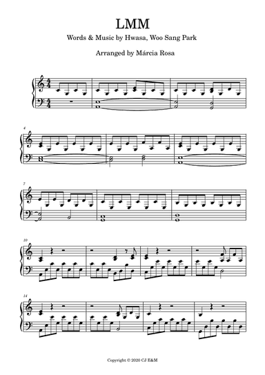 Piano Solo - Level 4 - Digital Download SKU: A0.513083 Composed by Hwasa and Woo Sang Park. Arranged by Marcia Rosa. Contemporary,Pop. Score. 6 pages. Marcia Rosa Koehler #123926. Published by Marcia Rosa Koehler (A0.513083). This solo piano arrangement is so beautiful and expressive. LMM brings a lot of feelings and emotions. This product was created by a member of ArrangeMe, Hal Leonard’s global self-publishing community of independent composers, arrangers, and songwriters. ArrangeMe allows for the publication of unique arrangements of both popular titles and original compositions from a wide variety of voices and backgrounds. About Digital Downloads Digital Downloads are downloadable sheet music files that can be viewed directly on your computer, tablet or mobile device. Once you download your digital sheet music, you can view and print it at home, school, or anywhere you want to make music, and you don’t have to be connected to the internet. Just purchase, download and play! PLEASE NOTE: Your Digital Download will have a watermark at the bottom of each page that will include your name, purchase date and number of copies purchased. You are only authorized to print the number of copies that you have purchased. You may not digitally distribute or print more copies than purchased for use (i.e., you may not print or digitally distribute individual copies to friends or students).