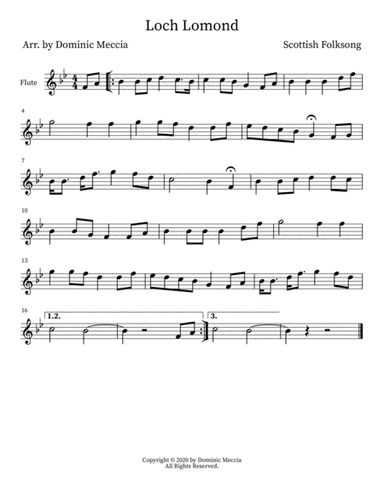Flute,Piano - Level 2 - Digital Download SKU: A0.1243480 Composed by Traditional Scottish Folk Song. Arranged by Lynette Auberjeunois. Chamber,Contest,Festival,Folk,Multicultural,Traditional,World. Score and part. 6 pages. Flute Files Publishing #838446. Published by Flute Files Publishing (A0.1243480). "Loch Lomond" flute solo sheet music. Traditional Scottish folk song arranged by Lynette Auberjeunois for late beginner/early intermediate level. Digital download in the key of C includes a one page flute solo and a two page piano score. Range: G1 to A2. Flute Files Publishing (FO70-1041). This product was created by a member of ArrangeMe, Hal Leonard’s global self-publishing community of independent composers, arrangers, and songwriters. ArrangeMe allows for the publication of unique arrangements of both popular titles and original compositions from a wide variety of voices and backgrounds. About Digital Downloads Digital Downloads are downloadable sheet music files that can be viewed directly on your computer, tablet or mobile device. Once you download your digital sheet music, you can view and print it at home, school, or anywhere you want to make music, and you don’t have to be connected to the internet. Just purchase, download and play! PLEASE NOTE: Your Digital Download will have a watermark at the bottom of each page that will include your name, purchase date and number of copies purchased. You are only authorized to print the number of copies that you have purchased. You may not digitally distribute or print more copies than purchased for use (i.e., you may not print or digitally distribute individual copies to friends or students).