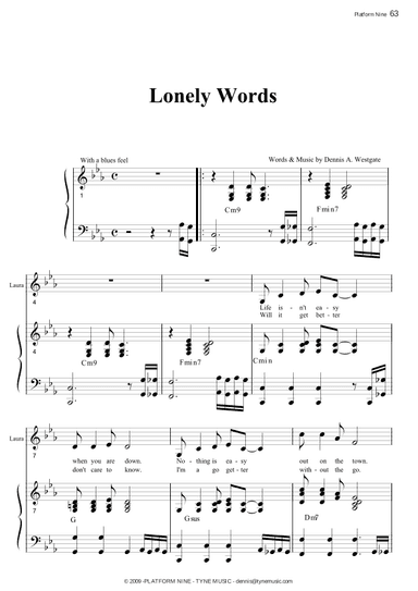 Guitar,Piano,Vocal,Voice - Level 3 - Digital Download SKU: A0.1075663 By TYNE MUSIC. By Dennis A Westgate. Arranged by Dennis A Westgate. Broadway,Country,Folk,Musical/Show. Score. 3 pages. Tyne Music #679850. Published by Tyne Music (A0.1075663). An original song from my musical 'Platform Nine' https://www.tynemusic.com/platformnine. This product was created by a member of ArrangeMe, Hal Leonard's global self-publishing community of independent composers, arrangers, and songwriters. ArrangeMe allows for the publication of unique arrangements of popular titles and original compositions from a variety of voices and backgrounds. The length, difficulty, and retail pricing are determined solely by the discretion of the person who arranged or composed it. About Digital Downloads Digital Downloads are downloadable sheet music files that can be viewed directly on your computer, tablet or mobile device. Once you download your digital sheet music, you can view and print it at home, school, or anywhere you want to make music, and you don’t have to be connected to the internet. Just purchase, download and play! PLEASE NOTE: Your Digital Download will have a watermark at the bottom of each page that will include your name, purchase date and number of copies purchased. You are only authorized to print the number of copies that you have purchased. You may not digitally distribute or print more copies than purchased for use (i.e., you may not print or digitally distribute individual copies to friends or students).