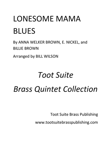 Brass Quintet - Level 3 - Digital Download SKU: A0.775336 Composed by Anna Welker Brown, Billie Brown, and E. Nickel. Arranged by Bill Wilson. Blues. 20 pages. Alexander Wilson #6660957. Published by Alexander Wilson (A0.775336). "Lonesome Mama Blues", by Anna Welker Brown, E. Nickel, and Billie Brown, is a moderate paced blues number with action in all parts. Arranged for brass quintet (two Bb trumpets, French horn, trombone, tuba) and optional drum set. Contact us at https://www.tootsuitebrasspublishing.com/about-us about the availability of additional transpositions. Performance time is approximately 3:06. Visit our website, www.tootsuitebrasspublishing.com, for a catalog of our arrangements available through sheetmusicplus.com. This product was created by a member of ArrangeMe, Hal Leonard's global self-publishing community of independent composers, arrangers, and songwriters. ArrangeMe allows for the publication of unique arrangements of popular titles and original compositions from a variety of voices and backgrounds. The length, difficulty, and retail pricing are determined solely by the discretion of the person who arranged or composed it. About Digital Downloads Digital Downloads are downloadable sheet music files that can be viewed directly on your computer, tablet or mobile device. Once you download your digital sheet music, you can view and print it at home, school, or anywhere you want to make music, and you don’t have to be connected to the internet. Just purchase, download and play! PLEASE NOTE: Your Digital Download will have a watermark at the bottom of each page that will include your name, purchase date and number of copies purchased. You are only authorized to print the number of copies that you have purchased. You may not digitally distribute or print more copies than purchased for use (i.e., you may not print or digitally distribute individual copies to friends or students).