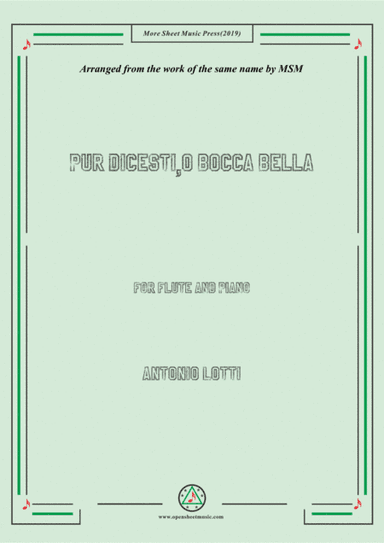 Flute,Piano - Level 3 - Digital Download SKU: A0.671435 Composed by Antonio Lotti. Arranged by MSM. Classical,Romantic Period. Score and part. 21 pages. Open Cloud #4801734. Published by Open Cloud (A0.671435). This product(include full and parts score) is a digital sheet music in PDF format. The music was composed by Lotti (Antonio Lotti), 1667-1740, arrange by MSM Press, for Flute and Piano. This product was created by a member of ArrangeMe, Hal Leonard’s global self-publishing community of independent composers, arrangers, and songwriters. ArrangeMe allows for the publication of unique arrangements of both popular titles and original compositions from a wide variety of voices and backgrounds. About Digital Downloads Digital Downloads are downloadable sheet music files that can be viewed directly on your computer, tablet or mobile device. Once you download your digital sheet music, you can view and print it at home, school, or anywhere you want to make music, and you don’t have to be connected to the internet. Just purchase, download and play! PLEASE NOTE: Your Digital Download will have a watermark at the bottom of each page that will include your name, purchase date and number of copies purchased. You are only authorized to print the number of copies that you have purchased. You may not digitally distribute or print more copies than purchased for use (i.e., you may not print or digitally distribute individual copies to friends or students).