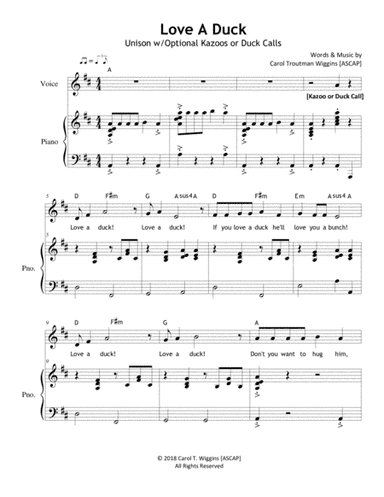 Choral Choir (Unison) - Level 1 - Digital Download SKU: A0.727297 Composed by Carol Troutman Wiggins. Children,Comedy,Contemporary,Holiday,Instructional. Octavo. 4 pages. Carol Troutman Wiggins #3447359. Published by Carol Troutman Wiggins (A0.727297). LOVE A DUCK!Unison w/Kazoos or Duck Calls Need an easy & jazzy, fun song about ducks? This song adds kazoos or duck calls to make a cute musical piece!Excellent for all age elementary studentsCues for kazoos or duck calls included in scoreEasy melody & rhythmsGreat for Valentine's Day!Chords included for additional instruments (Ukulele would be great!)Piano Accompaniment Track available on this site. This product was created by a member of ArrangeMe, Hal Leonard’s global self-publishing community of independent composers, arrangers, and songwriters. ArrangeMe allows for the publication of unique arrangements of both popular titles and original compositions from a wide variety of voices and backgrounds. About Digital Downloads Digital Downloads are downloadable sheet music files that can be viewed directly on your computer, tablet or mobile device. Once you download your digital sheet music, you can view and print it at home, school, or anywhere you want to make music, and you don’t have to be connected to the internet. Just purchase, download and play! PLEASE NOTE: Your Digital Download will have a watermark at the bottom of each page that will include your name, purchase date and number of copies purchased. You are only authorized to print the number of copies that you have purchased. You may not digitally distribute or print more copies than purchased for use (i.e., you may not print or digitally distribute individual copies to friends or students).