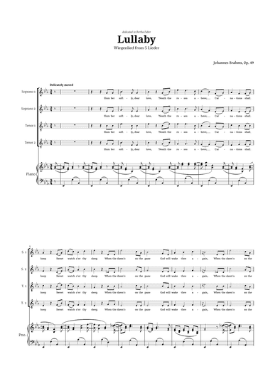 Choral Choir - Level 1 - Digital Download SKU: A0.1263394 Composed by Johannes Brahms. Arranged by Langanho. 19th Century,Children,Classical,Romantic Period. Octavo. 2 pages. Avery Lynn Jordan #856358. Published by Avery Lynn Jordan (A0.1263394). Experience the timeless charm of Brahms’ Lullaby, also known as Wiegenlied, in Opus 49, in a unique arrangement for SSTT choir and Piano with Choir. This delightful song has been carefully adapted to suit the vocal range of the performers, making it ideal for vocal students, teachers looking for instructional material, and parents wishing to encourage their children to explore classical music. This arrangement is incredibly accessible and easy to perform, making it perfect for academic studies as well as formal concerts. The sheet music has been meticulously transcribed to ensure accuracy and clarity in musical notation. The SSTT vocals intertwine smoothly, creating rich and melodic harmonies that resonate with delicacy and emotion. By purchasing this digital sheet music, you will gain immediate access to a high-quality PDF file that can be printed or used on electronic devices. This offers flexibility for practicing, studying, or performing the music anywhere, anytime. Our online sheet music store provides ease and convenience for musicians of all levels. Don’t miss the opportunity to add this beautiful piece to your choral repertoire. With our search engine optimized text, you will easily find this sheet music on top online search engines. Secure your digital copy of Brahms’ Lullaby, also known as Wiegenlied, in Opus 49, now and delight your audience with this unique arrangement. This product was created by a member of ArrangeMe, Hal Leonard’s global self-publishing community of independent composers, arrangers, and songwriters. ArrangeMe allows for the publication of unique arrangements of both popular titles and original compositions from a wide variety of voices and backgrounds. About Digital Downloads Digital Downloads are downloadable sheet music files that can be viewed directly on your computer, tablet or mobile device. Once you download your digital sheet music, you can view and print it at home, school, or anywhere you want to make music, and you don’t have to be connected to the internet. Just purchase, download and play! PLEASE NOTE: Your Digital Download will have a watermark at the bottom of each page that will include your name, purchase date and number of copies purchased. You are only authorized to print the number of copies that you have purchased. You may not digitally distribute or print more copies than purchased for use (i.e., you may not print or digitally distribute individual copies to friends or students).
