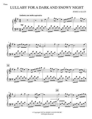 Piano Solo - Level 3 - Digital Download SKU: A0.941059 Composed by Joshua Allen. 20th Century,Contemporary. Score. 2 pages. Joshua Allen Music #6667207. Published by Joshua Allen Music (A0.941059). This simple piece for solo piano features a simple arpeggiated bass line, some cross-rhythms, and displaced RH and LH cadence points.  The performer is encouraged to use rubato throughout.  This piece is simple enough for the intermediate pianist, yet elegant and expressive enough for the professional. This product was created by a member of ArrangeMe, Hal Leonard’s global self-publishing community of independent composers, arrangers, and songwriters. ArrangeMe allows for the publication of unique arrangements of both popular titles and original compositions from a wide variety of voices and backgrounds. About Digital Downloads Digital Downloads are downloadable sheet music files that can be viewed directly on your computer, tablet or mobile device. Once you download your digital sheet music, you can view and print it at home, school, or anywhere you want to make music, and you don’t have to be connected to the internet. Just purchase, download and play! PLEASE NOTE: Your Digital Download will have a watermark at the bottom of each page that will include your name, purchase date and number of copies purchased. You are only authorized to print the number of copies that you have purchased. You may not digitally distribute or print more copies than purchased for use (i.e., you may not print or digitally distribute individual copies to friends or students).