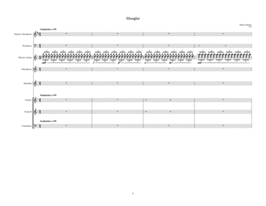 Large Ensemble Double Bass,Electric Guitar,Marimba,Soprano Saxophone,Trombone,Vibraphone,Violin - Digital Download SKU: A0.1032590 Composed by Manuel Robles. Arranged by Manuel Robles. 20th Century,Contemporary. Score and parts. 16 pages. Manuel Robles #5020071. Published by Manuel Robles (A0.1032590). A piece that means to incorporate the electric guitar into a chamber setting, replacing the piano rhythmically. It explores the amazing dynamic range of the electric guitar, strings, winds and brass; and their ability to dim out of perception like echoes into a void. ProgramManglar is a piece that seeks to emulate the motion of ripples that are generated by movements in the water around the roots of the tree Manglar (Mangrove). The electric guitar plays a clean and perpetual pedal that seeks to emulate the ripples. The attack is strong while the decay is slow and dims into nothingness, soon to be generated again. This piece makes use of serial techniques to control rhythm, dynamics and pitch, while retaining a sense of tonality.Appropriate for:Chamber performances, high school, college.  This product was created by a member of ArrangeMe, Hal Leonard's global self-publishing community of independent composers, arrangers, and songwriters. ArrangeMe allows for the publication of unique arrangements of popular titles and original compositions from a variety of voices and backgrounds. The length, difficulty, and retail pricing are determined solely by the discretion of the person who arranged or composed it. About Digital Downloads Digital Downloads are downloadable sheet music files that can be viewed directly on your computer, tablet or mobile device. Once you download your digital sheet music, you can view and print it at home, school, or anywhere you want to make music, and you don’t have to be connected to the internet. Just purchase, download and play! PLEASE NOTE: Your Digital Download will have a watermark at the bottom of each page that will include your name, purchase date and number of copies purchased. You are only authorized to print the number of copies that you have purchased. You may not digitally distribute or print more copies than purchased for use (i.e., you may not print or digitally distribute individual copies to friends or students).