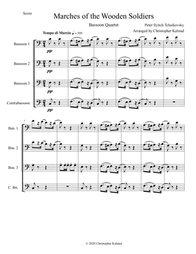 Woodwind Ensemble Contrabassoon - Level 3 - Digital Download SKU: A0.793233 Composed by Peter Ilyich Tchaikovsky. Arranged by Christopher Kalstad. Romantic Period,Standards. 8 pages. Christopher Kalstad #6129457. Published by Christopher Kalstad (A0.793233). "Marches of the Wooden Soldiers" from Tchaikovsky's Album for the Young is now arranged for bassoon quartet (Bsn. 1, 2, 3, and Contrabassoon). Tchaikovsky's melodic gift and musical charm are fully on display in this attractive light piece - perfect for any concert that features bassoon quartet. This product was created by a member of ArrangeMe, Hal Leonard's global self-publishing community of independent composers, arrangers, and songwriters. ArrangeMe allows for the publication of unique arrangements of popular titles and original compositions from a variety of voices and backgrounds. The length, difficulty, and retail pricing are determined solely by the discretion of the person who arranged or composed it. About Digital Downloads Digital Downloads are downloadable sheet music files that can be viewed directly on your computer, tablet or mobile device. Once you download your digital sheet music, you can view and print it at home, school, or anywhere you want to make music, and you don’t have to be connected to the internet. Just purchase, download and play! PLEASE NOTE: Your Digital Download will have a watermark at the bottom of each page that will include your name, purchase date and number of copies purchased. You are only authorized to print the number of copies that you have purchased. You may not digitally distribute or print more copies than purchased for use (i.e., you may not print or digitally distribute individual copies to friends or students).