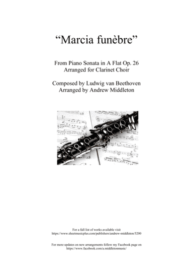 Woodwind Ensemble Clarinet - Level 3 - Digital Download SKU: A0.735624 Composed by Ludwig van Beethoven. Arranged by Andrew Middleton. Contemporary,Romantic Period. 25 pages. Andrew Middleton #5290109. Published by Andrew Middleton (A0.735624). "Marcia funebre" is the third movement from Beethoven's Piano Sonata in A flat Op. 26. This arrangement has been arranged for clarinet choir (6 clarinets in B flat and 1 bass clarinet in B flat). For more updates on new arrangements follow my Facebook page on https://www.facebook.com/a.middletonmusic/ Or subscribe to my Youtube page at https://www.youtube.com/channel/UCClIYqddA2wMpdaxSq3BKEw?view_as=subscriber This product was created by a member of ArrangeMe, Hal Leonard’s global self-publishing community of independent composers, arrangers, and songwriters. ArrangeMe allows for the publication of unique arrangements of both popular titles and original compositions from a wide variety of voices and backgrounds. About Digital Downloads Digital Downloads are downloadable sheet music files that can be viewed directly on your computer, tablet or mobile device. Once you download your digital sheet music, you can view and print it at home, school, or anywhere you want to make music, and you don’t have to be connected to the internet. Just purchase, download and play! PLEASE NOTE: Your Digital Download will have a watermark at the bottom of each page that will include your name, purchase date and number of copies purchased. You are only authorized to print the number of copies that you have purchased. You may not digitally distribute or print more copies than purchased for use (i.e., you may not print or digitally distribute individual copies to friends or students).