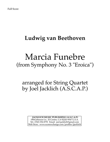 String Quartet Cello,String Quartet,Viola,Violin - Level 5 - Digital Download SKU: A0.1112923 Composed by Ludwig van Beethoven. Arranged by Joel Jacklich (A.S.C.A.P.). Chamber,Classical,March,Romantic Period. 47 pages. Joel Jacklich #714873. Published by Joel Jacklich (A0.1112923). Beethoven's famous Funeral March from his "Eroica" Symphony is here arranged for string quartet by Joel Jacklich (A.S.C.A.P.). Special care has been taken to provide page turns only at rests in the individual parts. This is a challenging work for advanced players. This product was created by a member of ArrangeMe, Hal Leonard's global self-publishing community of independent composers, arrangers, and songwriters. ArrangeMe allows for the publication of unique arrangements of popular titles and original compositions from a variety of voices and backgrounds. The length, difficulty, and retail pricing are determined solely by the discretion of the person who arranged or composed it. About Digital Downloads Digital Downloads are downloadable sheet music files that can be viewed directly on your computer, tablet or mobile device. Once you download your digital sheet music, you can view and print it at home, school, or anywhere you want to make music, and you don’t have to be connected to the internet. Just purchase, download and play! PLEASE NOTE: Your Digital Download will have a watermark at the bottom of each page that will include your name, purchase date and number of copies purchased. You are only authorized to print the number of copies that you have purchased. You may not digitally distribute or print more copies than purchased for use (i.e., you may not print or digitally distribute individual copies to friends or students).