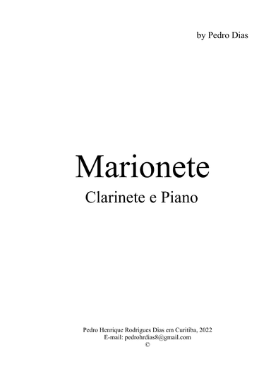 B-Flat Clarinet,Piano - Level 3 - Digital Download SKU: A0.1277681 By Pedro Dias. By Pedro Dias. Arranged by Pedro Dias. 21st Century,Chamber,Contemporary. Score and part. 10 pages. Pedro Dias #869363. Published by Pedro Dias (A0.1277681). Instrumentação: Clarinete (Bb) e Piano (música de câmara).Nível: Intermediário.Tonalidade: Am. Número de Páginas: 10.Duração Aproximada: 3 min.Conteúdo: grade e parts individuais para cada instrumento.Composição de Pedro Henrique Rodrigues Dias. Instruments: Clarinet (Bb) and Piano (chamber music).Level: Intermediate.Key: Am.Number of Pages: 10.Approximate duration: 3 min.Includes: score and individual parts for each instrument.Written by Pedro Henrique Rodrigues Dias. This product was created by a member of ArrangeMe, Hal Leonard's global self-publishing community of independent composers, arrangers, and songwriters. ArrangeMe allows for the publication of unique arrangements of popular titles and original compositions from a variety of voices and backgrounds. The length, difficulty, and retail pricing are determined solely by the discretion of the person who arranged or composed it. About Digital Downloads Digital Downloads are downloadable sheet music files that can be viewed directly on your computer, tablet or mobile device. Once you download your digital sheet music, you can view and print it at home, school, or anywhere you want to make music, and you don’t have to be connected to the internet. Just purchase, download and play! PLEASE NOTE: Your Digital Download will have a watermark at the bottom of each page that will include your name, purchase date and number of copies purchased. You are only authorized to print the number of copies that you have purchased. You may not digitally distribute or print more copies than purchased for use (i.e., you may not print or digitally distribute individual copies to friends or students).