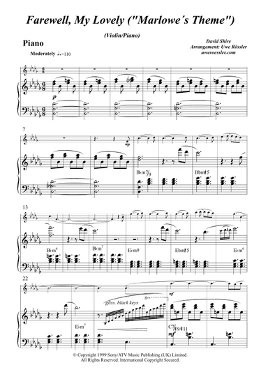 Piano Quintet,String Ensemble Cello,Double Bass,Piano,Violin - Level 4 - Digital Download SKU: A0.1090896 Composed by David L Shire. Arranged by Uwe Roessler Rössler Rassler. 20th Century,Film/TV,Jazz,Standards. Score and parts. 12 pages. Uwe Roessler #695036. Published by Uwe Roessler (A0.1090896). The opening title of the soundtrack from the movie ”Farewell, My Lovely” (1975), with the great Robert Mitchum. Aka “Marlowe´s Theme”. As Leif “Smoke Rings” Anderson said about this piece: “It tells a sadly story about a lonely man walking away in the night, going nowhere.” The relaxed tempo makes it an ideal piece for after-hours. And the jazzy chords are just marvellous! Piano voice is written out - with additional chord symbols for your own voicings. As for the title, the name of the piece: I am not entirely sure, whether “Marlowe´s Theme” is correct. The music of the opening scene has no name, as far as I´ve been able to determine, and on Davis Shire´s own piano solo version there´s a combination of this piece with “Marlowe´s Theme”. But, there you go … . It´s fantastic music, anyway. This very effective arrangement follows the form of the original soundtrack (hence the youtube link). Original key (Bb minor). The form is: Piano intro (with the original piano pattern), theme in violin, cello plays half the theme, joined by tutti, piano plays half the theme as outro. Duration: approx 02.10 min. For Piano Trio / Quartet / Quintet. Minimal instrumentation: violin1, cello, piano. Optional voices for violin2, and bass included. Professional sheet material. Comes with full score, and complete individual parts. Level: intermediate/advanced. I´ve listed quite a lot of songs, so far: Movie Themes and classic Pop songs for this kind of instrumentation, and others. Browse ;-) Have fun with my arrangements! This product was created by a member of ArrangeMe, Hal Leonard's global self-publishing community of independent composers, arrangers, and songwriters. ArrangeMe allows for the publication of unique arrangements of popular titles and original compositions from a variety of voices and backgrounds. The length, difficulty, and retail pricing are determined solely by the discretion of the person who arranged or composed it. About Digital Downloads Digital Downloads are downloadable sheet music files that can be viewed directly on your computer, tablet or mobile device. Once you download your digital sheet music, you can view and print it at home, school, or anywhere you want to make music, and you don’t have to be connected to the internet. Just purchase, download and play! PLEASE NOTE: Your Digital Download will have a watermark at the bottom of each page that will include your name, purchase date and number of copies purchased. You are only authorized to print the number of copies that you have purchased. You may not digitally distribute or print more copies than purchased for use (i.e., you may not print or digitally distribute individual copies to friends or students).