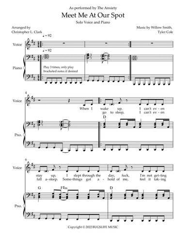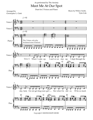 Piano,Voice Duet Piano,Voice - Level 3 - Digital Download SKU: A0.903050 By Willow. By Tyler Cole and Willow Smith. Arranged by Christopher L. Clark. Contemporary. 7 pages. Christopher L. Clark #6710695. Published by Christopher L. Clark (A0.903050). Duet version of the viral hit by Willow Smith and Tyler Cole, also known as The Anxiety. The vocal solo version of this piece is also available on this site. . This product was created by a member of ArrangeMe, Hal Leonard’s global self-publishing community of independent composers, arrangers, and songwriters. ArrangeMe allows for the publication of unique arrangements of both popular titles and original compositions from a wide variety of voices and backgrounds. About Digital Downloads Digital Downloads are downloadable sheet music files that can be viewed directly on your computer, tablet or mobile device. Once you download your digital sheet music, you can view and print it at home, school, or anywhere you want to make music, and you don’t have to be connected to the internet. Just purchase, download and play! PLEASE NOTE: Your Digital Download will have a watermark at the bottom of each page that will include your name, purchase date and number of copies purchased. You are only authorized to print the number of copies that you have purchased. You may not digitally distribute or print more copies than purchased for use (i.e., you may not print or digitally distribute individual copies to friends or students).