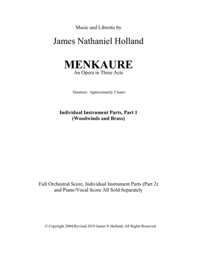 Woodwind Ensemble Clarinet - Level 5 - Digital Download SKU: A0.730489 Composed by James Nathaniel Holland. Contemporary,Musical/Show,Opera. 294 pages. James Nathaniel Holland #4609311. Published by James Nathaniel Holland (A0.730489). MENKAURE An Opera in 3 Acts (In English) INDIVIDUAL INSTRUMENT PARTS, PART 1 (WOODWIND AND BRASS) Individual Instrument Parts 2 of 2, Full Orchestral Score and Piano Vocal Score Sold Separately.Music and Libretto by James Nathaniel Holland Composer website: https://www.facebook.com/jamesnathanielholland/ Complete Opera recorded from Live Concert on YouTube: https://www.youtube.com/playlist?list=PLEcbVsA36MCuT1hxkTAyLuChFGJjtj4Ia(Duration: Approximately 2 hours)SYNOPSIS: 6,000 years ago an almighty ruler died in Aksum. But today he lives for one woman, Trista,who falls in love with his statue at the Metropolitan Museum of Art. She is pulled deep into obsession, and her family is unable to rescue her; she tries to kiss the statue’s face, and is arrested. With a quest to find the statue’s twin, she flees to the country Joondor, site of the ancient city of Aksum where she is ultimately consumed by her love for Menkaure. SINGERS TRISTA, Soprano (Lyric, Lead Role) A young woman DELPHIE, Soprano (Coloratura, Principal role) Her mother MRS. SNODGRASS, Alto or Countertenor (Comedic) The Met’s docent CONSOLIDAS, True Bass (Principal role) A guide in the country of Joondor ERIK, Baritone, The much younger boyfriend of Delphie THE HIGH PREIST AND A SAINT, Tenor Chorus SATB with minor rolesInstrumentation: picc/bassflute, fl12,ob,eh,cl12,basscl,bsn,hrn12,tpt12,trom12,tba,timp,perc (bass drm, djembe,bongos, cymbals, wood blk, claves, tri, finger cym., snare) harp, strings This product was created by a member of ArrangeMe, Hal Leonard’s global self-publishing community of independent composers, arrangers, and songwriters. ArrangeMe allows for the publication of unique arrangements of both popular titles and original compositions from a wide variety of voices and backgrounds. About Digital Downloads Digital Downloads are downloadable sheet music files that can be viewed directly on your computer, tablet or mobile device. Once you download your digital sheet music, you can view and print it at home, school, or anywhere you want to make music, and you don’t have to be connected to the internet. Just purchase, download and play! PLEASE NOTE: Your Digital Download will have a watermark at the bottom of each page that will include your name, purchase date and number of copies purchased. You are only authorized to print the number of copies that you have purchased. You may not digitally distribute or print more copies than purchased for use (i.e., you may not print or digitally distribute individual copies to friends or students).