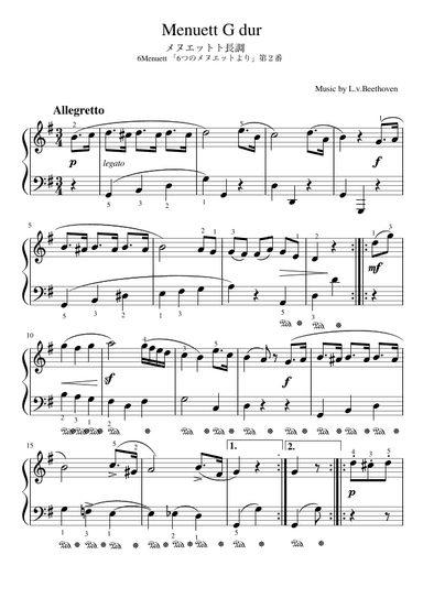 Easy Piano - Level 1 - Digital Download SKU: A0.1179586 By Ludwig van Beethoven. By Ludwig van Beethoven. Arranged by pfkaori. Classical. Score. 3 pages. Pfkaorimusic #779570. Published by pfkaorimusic (A0.1179586). Menuett G dur. L.v.Beethoven pianosolo (easy)〜Large sheet music * Easy to read〜. This product was created by a member of ArrangeMe, Hal Leonard's global self-publishing community of independent composers, arrangers, and songwriters. ArrangeMe allows for the publication of unique arrangements of popular titles and original compositions from a variety of voices and backgrounds. The length, difficulty, and retail pricing are determined solely by the discretion of the person who arranged or composed it. About Digital Downloads Digital Downloads are downloadable sheet music files that can be viewed directly on your computer, tablet or mobile device. Once you download your digital sheet music, you can view and print it at home, school, or anywhere you want to make music, and you don’t have to be connected to the internet. Just purchase, download and play! PLEASE NOTE: Your Digital Download will have a watermark at the bottom of each page that will include your name, purchase date and number of copies purchased. You are only authorized to print the number of copies that you have purchased. You may not digitally distribute or print more copies than purchased for use (i.e., you may not print or digitally distribute individual copies to friends or students).
