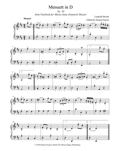 Piano Solo - Level 3 - Digital Download SKU: A0.879325 Composed by Leopold Mozart. Arranged by Dennis Frayne. Classical,Multicultural,Standards,World. Score. 1 pages. Presto! It's Music Magic Publishing #6195825. Published by Presto! It's Music Magic Publishing (A0.879325). Menuett in D, No. 10 from Notebook for Maria Anna (Nannerl) Mozart, by Leopold Mozart (1719-1787), the father of Wolfgang Amadeus Mozart (1756-1791). Includes helpful fingering suggestions. This product was created by a member of ArrangeMe, Hal Leonard’s global self-publishing community of independent composers, arrangers, and songwriters. ArrangeMe allows for the publication of unique arrangements of both popular titles and original compositions from a wide variety of voices and backgrounds. About Digital Downloads Digital Downloads are downloadable sheet music files that can be viewed directly on your computer, tablet or mobile device. Once you download your digital sheet music, you can view and print it at home, school, or anywhere you want to make music, and you don’t have to be connected to the internet. Just purchase, download and play! PLEASE NOTE: Your Digital Download will have a watermark at the bottom of each page that will include your name, purchase date and number of copies purchased. You are only authorized to print the number of copies that you have purchased. You may not digitally distribute or print more copies than purchased for use (i.e., you may not print or digitally distribute individual copies to friends or students).