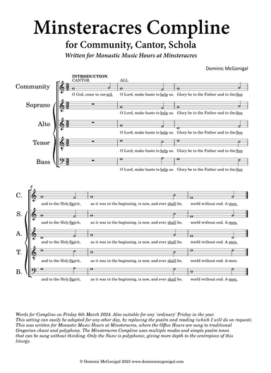 Choral Choir,Choral (SATB) - Level 2 - Digital Download SKU: A0.1348655 By Monastic Music Hours. By Dominic McGonigal. 21st Century,Classical,Contemporary. 15 pages. C8 Music #933437. Published by C8 Music (A0.1348655). The Minsteracres Compline was written for Monastic Music Hours, a musical retreat in the beautiful Minsteracres in Northumberland. It is a simple setting of the Night Prayer, drawing on the long tradition of liturgical music for the Office Hours. The psalm tones and responses are intuitive for the congregation, with the SATB choir providing modal 4-part harmony. The Nunc Dimittis open up to contrapuntal treatment, yet still retaining a simple, reflective quality. Scored for Cantor, Congregation, SATB Choir. 9'. More at www.dominicmcgonigal.com. This product was created by a member of ArrangeMe, Hal Leonard's global self-publishing community of independent composers, arrangers, and songwriters. ArrangeMe allows for the publication of unique arrangements of popular titles and original compositions from a variety of voices and backgrounds. The length, difficulty, and retail pricing are determined solely by the discretion of the person who arranged or composed it. About Digital Downloads Digital Downloads are downloadable sheet music files that can be viewed directly on your computer, tablet or mobile device. Once you download your digital sheet music, you can view and print it at home, school, or anywhere you want to make music, and you don’t have to be connected to the internet. Just purchase, download and play! PLEASE NOTE: Your Digital Download will have a watermark at the bottom of each page that will include your name, purchase date and number of copies purchased. You are only authorized to print the number of copies that you have purchased. You may not digitally distribute or print more copies than purchased for use (i.e., you may not print or digitally distribute individual copies to friends or students).
