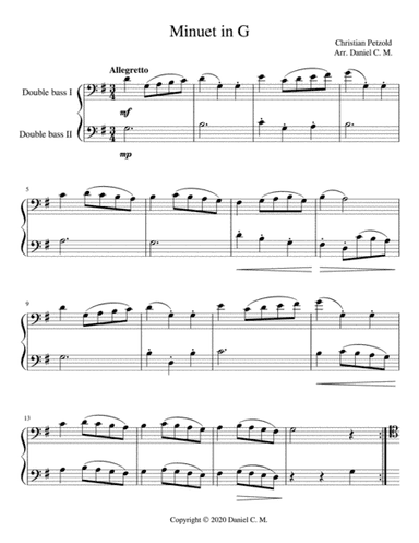 Instrumental Duet Double Bass,Instrumental Duet - Level 2 - Digital Download SKU: A0.810248 Composed by Johann Sebastian Bach, Christian Petzold. Arranged by Daniel C. M. Baroque,Concert,Standards. Score and parts. 4 pages. Daniel C. M. #5873469. Published by Daniel C. M. (A0.810248). This work is attributed to Johann Sebastian Bach. It is used the name of the now attributed composer Christian Petzold for there is new information about him. This arrangement is written for double bass duet. The difficulty level is basically easy as the original for both parts. The articulations and dynamics are meticulously written to help to get a better approach to the style but, of course, it's only a guide that can be changed. This product was created by a member of ArrangeMe, Hal Leonard’s global self-publishing community of independent composers, arrangers, and songwriters. ArrangeMe allows for the publication of unique arrangements of both popular titles and original compositions from a wide variety of voices and backgrounds. About Digital Downloads Digital Downloads are downloadable sheet music files that can be viewed directly on your computer, tablet or mobile device. Once you download your digital sheet music, you can view and print it at home, school, or anywhere you want to make music, and you don’t have to be connected to the internet. Just purchase, download and play! PLEASE NOTE: Your Digital Download will have a watermark at the bottom of each page that will include your name, purchase date and number of copies purchased. You are only authorized to print the number of copies that you have purchased. You may not digitally distribute or print more copies than purchased for use (i.e., you may not print or digitally distribute individual copies to friends or students).