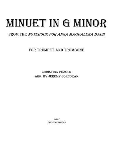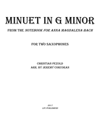 Instrumental Duet Clarinet,Flute,Instrumental Duet - Level 3 - Digital Download SKU: A0.714279 Composed by Christian Pezold. Arranged by Jeremy Corcoran. Baroque,Concert,Standards,World. Score and parts. 2 pages. LPC Publishers #3111305. Published by LPC Publishers (A0.714279). This arrangement of Minuet in G Minor lends itself beautifully to the sound of both flute and clarinet. Parts stay in the comfortable range of both instruments, while remaining challenging. Great for recitals or special music at church. This product was created by a member of ArrangeMe, Hal Leonard's global self-publishing community of independent composers, arrangers, and songwriters. ArrangeMe allows for the publication of unique arrangements of popular titles and original compositions from a variety of voices and backgrounds. The length, difficulty, and retail pricing are determined solely by the discretion of the person who arranged or composed it. About Digital Downloads Digital Downloads are downloadable sheet music files that can be viewed directly on your computer, tablet or mobile device. Once you download your digital sheet music, you can view and print it at home, school, or anywhere you want to make music, and you don’t have to be connected to the internet. Just purchase, download and play! PLEASE NOTE: Your Digital Download will have a watermark at the bottom of each page that will include your name, purchase date and number of copies purchased. You are only authorized to print the number of copies that you have purchased. You may not digitally distribute or print more copies than purchased for use (i.e., you may not print or digitally distribute individual copies to friends or students).