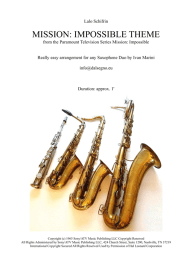 Brass Band - Level 4 - Digital Download SKU: A0.512909 By Adam Clayton And Larry Mullen. By Lalo Schifrin. Arranged by Roger Wallace. Christmas,Film/TV,Pop. 66 pages. Roger Wallace #5709849. Published by Roger Wallace (A0.512909). Mission: Immanuel - "O Come, O Come, Immanuel (Emmanuel)" & "Mission: Impossible" Theme British Brass Band (or Brass Choir). Features all parts. Begins with O Come, O Come, Immanuel (in a slow tempo) and transitions to the faster rhythmic and melodic lines from the Mission: Impossible theme. The second section is a blending of O Come, O Come, Immanuel and the Mission: Impossible theme. Includes optional Percussion parts (Bongo Drums and Claves) joining for the Mission: Impossible theme. In addition to traditional Brass Brand notation (Treble Clef), Low Brass parts in Bass Clef are included to facilitate use by a Brass Choir as well as players unfamiliar with Brass Brand notation. NOTE: Audio sample clip begins at measure 18. A full length audio version can be heard in the YouTube video.This arrangement is also available for many other ensembles and soloists. Look for more arrangements by Roger Wallace. This product was created by a member of ArrangeMe, Hal Leonard's global self-publishing community of independent composers, arrangers, and songwriters. ArrangeMe allows for the publication of unique arrangements of popular titles and original compositions from a variety of voices and backgrounds. The length, difficulty, and retail pricing are determined solely by the discretion of the person who arranged or composed it. About Digital Downloads Digital Downloads are downloadable sheet music files that can be viewed directly on your computer, tablet or mobile device. Once you download your digital sheet music, you can view and print it at home, school, or anywhere you want to make music, and you don’t have to be connected to the internet. Just purchase, download and play! PLEASE NOTE: Your Digital Download will have a watermark at the bottom of each page that will include your name, purchase date and number of copies purchased. You are only authorized to print the number of copies that you have purchased. You may not digitally distribute or print more copies than purchased for use (i.e., you may not print or digitally distribute individual copies to friends or students).