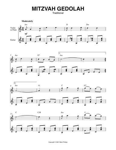 Instrumental Duet Guitar,Instrumental Duet,Violin - Level 3 - Digital Download SKU: A0.692425 Composed by Traditional. Arranged by Mark Phillips. Hanukkah,Jewish,World. Score and parts. 2 pages. A. J. Cornell Publications #6510205. Published by A. J. Cornell Publications (A0.692425). "Mitzvah Gedolah" for violin or flute with guitar accompaniment This product was created by a member of ArrangeMe, Hal Leonard's global self-publishing community of independent composers, arrangers, and songwriters. ArrangeMe allows for the publication of unique arrangements of popular titles and original compositions from a variety of voices and backgrounds. The length, difficulty, and retail pricing are determined solely by the discretion of the person who arranged or composed it. About Digital Downloads Digital Downloads are downloadable sheet music files that can be viewed directly on your computer, tablet or mobile device. Once you download your digital sheet music, you can view and print it at home, school, or anywhere you want to make music, and you don’t have to be connected to the internet. Just purchase, download and play! PLEASE NOTE: Your Digital Download will have a watermark at the bottom of each page that will include your name, purchase date and number of copies purchased. You are only authorized to print the number of copies that you have purchased. You may not digitally distribute or print more copies than purchased for use (i.e., you may not print or digitally distribute individual copies to friends or students).