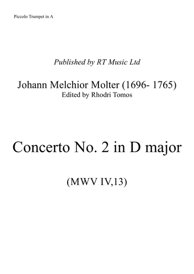 Trumpet Solo - Level 5 - Digital Download SKU: A0.865025 Composed by Johann Melchior Molter (1696-1765). Arranged by Rhodri Tomos. Baroque. Individual part. 40 pages. RT Music Ltd #6301879. Published by RT Music Ltd (A0.865025). Molter Concerto No.2 in D major. Solo parts piccolo trumpet in A & trumpets in D, C & Bb for 1. Allegro 2. Adagio 3. Allegro. This product was created by a member of ArrangeMe, Hal Leonard's global self-publishing community of independent composers, arrangers, and songwriters. ArrangeMe allows for the publication of unique arrangements of popular titles and original compositions from a variety of voices and backgrounds. The length, difficulty, and retail pricing are determined solely by the discretion of the person who arranged or composed it. About Digital Downloads Digital Downloads are downloadable sheet music files that can be viewed directly on your computer, tablet or mobile device. Once you download your digital sheet music, you can view and print it at home, school, or anywhere you want to make music, and you don’t have to be connected to the internet. Just purchase, download and play! PLEASE NOTE: Your Digital Download will have a watermark at the bottom of each page that will include your name, purchase date and number of copies purchased. You are only authorized to print the number of copies that you have purchased. You may not digitally distribute or print more copies than purchased for use (i.e., you may not print or digitally distribute individual copies to friends or students).