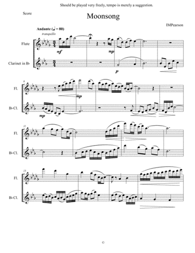 Instrumental Duet Clarinet,Flute,Instrumental Duet - Level 3 - Digital Download SKU: A0.1032920 Composed by Isabelle M. Pearson. Concert,Contemporary,Holiday,New Age,Wedding. Score and parts. 2 pages. IMPMusicProductions #5795203. Published by IMPMusicProductions (A0.1032920). Flute and Clarinet DuetAppropriate for Students -district festival and onwards Pleasant Performance/Showcase PieceThe tempo is variable based on preference, usually between 80-100 BPMMoonsong is a piece of music that evokes an image of nature. The lines of flute and clarinet rise and fall like water or a breeze, and the warm, held notes between instruments are the moonlight coming through the branches. This is a very interpretive and expressional piece of music, designed to project imagery into the audience's heads and paint a picture of a moment in time. Enjoy!Contact the composer at [email protected]. This product was created by a member of ArrangeMe, Hal Leonard’s global self-publishing community of independent composers, arrangers, and songwriters. ArrangeMe allows for the publication of unique arrangements of both popular titles and original compositions from a wide variety of voices and backgrounds. About Digital Downloads Digital Downloads are downloadable sheet music files that can be viewed directly on your computer, tablet or mobile device. Once you download your digital sheet music, you can view and print it at home, school, or anywhere you want to make music, and you don’t have to be connected to the internet. Just purchase, download and play! PLEASE NOTE: Your Digital Download will have a watermark at the bottom of each page that will include your name, purchase date and number of copies purchased. You are only authorized to print the number of copies that you have purchased. You may not digitally distribute or print more copies than purchased for use (i.e., you may not print or digitally distribute individual copies to friends or students).