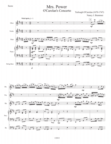 Small Ensemble Double Bass,Oboe,Piano Accompaniment,Tin Whistle,Violin - Level 5 - Digital Download SKU: A0.945637 Composed by Turlough O'carolan. Arranged by Nancy J. Brammer. Celtic. Score and parts. 8 pages. Nancy Brammer #6051643. Published by Nancy Brammer (A0.945637). Also known as O'Carolan's Concerto, Mrs. Power is a delightful piece of Irish music in D major. O'Carolan is a well known Irish composer who lived 1670-1747. This arrangement is for Oboe (or a talented Penny Whistle), Violin, Harp, Piano and Bass. The parts are advanced especially for the violin and harp. The oboe part could also be played by soprano recorder. This product was created by a member of ArrangeMe, Hal Leonard’s global self-publishing community of independent composers, arrangers, and songwriters. ArrangeMe allows for the publication of unique arrangements of both popular titles and original compositions from a wide variety of voices and backgrounds. About Digital Downloads Digital Downloads are downloadable sheet music files that can be viewed directly on your computer, tablet or mobile device. Once you download your digital sheet music, you can view and print it at home, school, or anywhere you want to make music, and you don’t have to be connected to the internet. Just purchase, download and play! PLEASE NOTE: Your Digital Download will have a watermark at the bottom of each page that will include your name, purchase date and number of copies purchased. You are only authorized to print the number of copies that you have purchased. You may not digitally distribute or print more copies than purchased for use (i.e., you may not print or digitally distribute individual copies to friends or students).