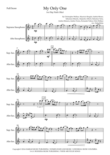 Bass Flute,Piano - Level 4 - Digital Download SKU: A0.1271800 By Sebastian Yatra. By Alejandra Alberti, Andres Munera, Andres Torres, Chris Wallace, Christopher Wallace, Fernando Tobon, Isabela Moner, Mauricio Rengifo, Sebastian Obando, and Sebastian Yatra. Arranged by Ottirb Sage. Latin,Pop,Wedding. Score and part. 11 pages. Fabio Britto #864155. Published by Fabio Britto (A0.1271800). Arrangement of the song My Only One (No Hay Nadie Mas) for Flute Solo and Piano Accompaniment. This product was created by a member of ArrangeMe, Hal Leonard’s global self-publishing community of independent composers, arrangers, and songwriters. ArrangeMe allows for the publication of unique arrangements of both popular titles and original compositions from a wide variety of voices and backgrounds. About Digital Downloads Digital Downloads are downloadable sheet music files that can be viewed directly on your computer, tablet or mobile device. Once you download your digital sheet music, you can view and print it at home, school, or anywhere you want to make music, and you don’t have to be connected to the internet. Just purchase, download and play! PLEASE NOTE: Your Digital Download will have a watermark at the bottom of each page that will include your name, purchase date and number of copies purchased. You are only authorized to print the number of copies that you have purchased. You may not digitally distribute or print more copies than purchased for use (i.e., you may not print or digitally distribute individual copies to friends or students).