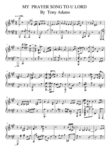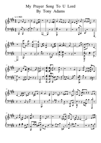 Piano,Vocal,Voice - Level 4 - Digital Download SKU: A0.1132743 By Tony Adams. By Nathaniel Tony Adams. Arranged by Nathaniel Tony Adams....strings and horns Felton Pilate. 20th Century,Christian,Christmas,Film/TV,Praise & Worship. Score. 6 pages. Nathaniel Tony Adams Publishing Sa BMI #732940. Published by Nathaniel Tony Adams Publishing Sa BMI (A0.1132743). My Prayer Song To U Lord. By Tony Adams Nathaniel Tony Adams Publishing Sa BMI [email protected]. This product was created by a member of ArrangeMe, Hal Leonard's global self-publishing community of independent composers, arrangers, and songwriters. ArrangeMe allows for the publication of unique arrangements of popular titles and original compositions from a variety of voices and backgrounds. The length, difficulty, and retail pricing are determined solely by the discretion of the person who arranged or composed it. About Digital Downloads Digital Downloads are downloadable sheet music files that can be viewed directly on your computer, tablet or mobile device. Once you download your digital sheet music, you can view and print it at home, school, or anywhere you want to make music, and you don’t have to be connected to the internet. Just purchase, download and play! PLEASE NOTE: Your Digital Download will have a watermark at the bottom of each page that will include your name, purchase date and number of copies purchased. You are only authorized to print the number of copies that you have purchased. You may not digitally distribute or print more copies than purchased for use (i.e., you may not print or digitally distribute individual copies to friends or students).