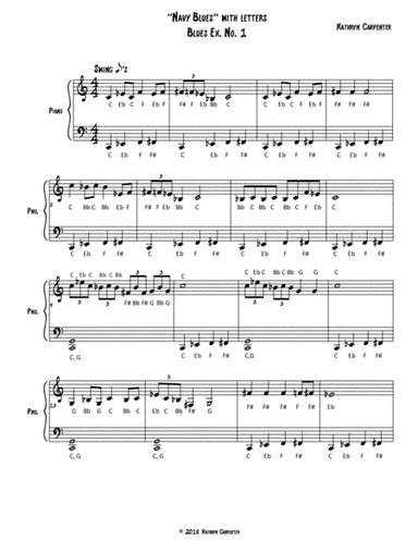 Piano Solo - Level 4 - Digital Download SKU: A0.807273 Composed by Kathryn Carpenter. Blues,Concert,Instructional,Jazz,Standards. Score. 3 pages. Kathryn Carpenter #3537101. Published by Kathryn Carpenter (A0.807273). Navy Blues (Piece composed by: Kathryn Carpenter)* Blues study piece or repertoire piece * Employs the blues in C (C minor feel)* C blues bass line* Includes letter designation for the piano student learning independently This product was created by a member of ArrangeMe, Hal Leonard's global self-publishing community of independent composers, arrangers, and songwriters. ArrangeMe allows for the publication of unique arrangements of popular titles and original compositions from a variety of voices and backgrounds. The length, difficulty, and retail pricing are determined solely by the discretion of the person who arranged or composed it. About Digital Downloads Digital Downloads are downloadable sheet music files that can be viewed directly on your computer, tablet or mobile device. Once you download your digital sheet music, you can view and print it at home, school, or anywhere you want to make music, and you don’t have to be connected to the internet. Just purchase, download and play! PLEASE NOTE: Your Digital Download will have a watermark at the bottom of each page that will include your name, purchase date and number of copies purchased. You are only authorized to print the number of copies that you have purchased. You may not digitally distribute or print more copies than purchased for use (i.e., you may not print or digitally distribute individual copies to friends or students).