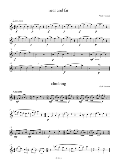 Flute Solo - Level 1 - Digital Download SKU: A0.947202 Composed by Nick Hunter. Contemporary,Instructional. Individual part. 2 pages. Nick Hunter #2013901. Published by Nick Hunter (A0.947202). Four new, interesting and exciting early level pieces for solo flute! From the book, 'Cascade and other pieces for solo flute' (early to advanced level solo flute music, other pieces available on Sheet Music Plus). These four early level pieces are a good introduction to modern music that will help develop technique and expressive musical playing. This product was created by a member of ArrangeMe, Hal Leonard's global self-publishing community of independent composers, arrangers, and songwriters. ArrangeMe allows for the publication of unique arrangements of popular titles and original compositions from a variety of voices and backgrounds. The length, difficulty, and retail pricing are determined solely by the discretion of the person who arranged or composed it. About Digital Downloads Digital Downloads are downloadable sheet music files that can be viewed directly on your computer, tablet or mobile device. Once you download your digital sheet music, you can view and print it at home, school, or anywhere you want to make music, and you don’t have to be connected to the internet. Just purchase, download and play! PLEASE NOTE: Your Digital Download will have a watermark at the bottom of each page that will include your name, purchase date and number of copies purchased. You are only authorized to print the number of copies that you have purchased. You may not digitally distribute or print more copies than purchased for use (i.e., you may not print or digitally distribute individual copies to friends or students).