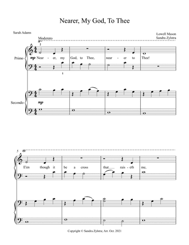Easy Piano - Level 1 - Digital Download SKU: A0.712737 Composed by Lowell Mason. Arranged by Sandra Zylstra. Children,Christian,Sacred. Score. 4 pages. Sandra dee zylstra #6607365. Published by sandra dee zylstra (A0.712737). Nearer, My God, To Thee is arranged as a beginner solo with an optional elementary duet. This arrangement has both the stacked and separate scores included. When played as a duet the beginner part will be played one octave higher. You can also purchase the book Beginner Hymns & Spirituals which are 18 beginning solos with an optional elementary duet at: https://www.sheetmusicplus.com/title/beginner-hymns-spirituals-piano-solo-with-optional-elementary-d..... You can look at other arrangements by Sandra Zylstra on Sheet Music Plus: https://www.sheetmusicplus.com/formats/singles/sandra-zylstra/600092+3001855 and at Piano Pronto: Composers Community https://pianopronto.com/composers-community/sandra-zylstra/. This product was created by a member of ArrangeMe, Hal Leonard's global self-publishing community of independent composers, arrangers, and songwriters. ArrangeMe allows for the publication of unique arrangements of popular titles and original compositions from a variety of voices and backgrounds. The length, difficulty, and retail pricing are determined solely by the discretion of the person who arranged or composed it. About Digital Downloads Digital Downloads are downloadable sheet music files that can be viewed directly on your computer, tablet or mobile device. Once you download your digital sheet music, you can view and print it at home, school, or anywhere you want to make music, and you don’t have to be connected to the internet. Just purchase, download and play! PLEASE NOTE: Your Digital Download will have a watermark at the bottom of each page that will include your name, purchase date and number of copies purchased. You are only authorized to print the number of copies that you have purchased. You may not digitally distribute or print more copies than purchased for use (i.e., you may not print or digitally distribute individual copies to friends or students).