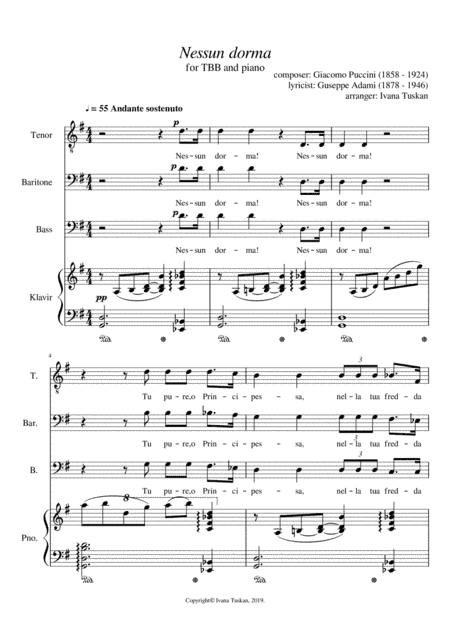 Nessun dorma, for TBB and piano, G major (arr. Ivana Tuskan)