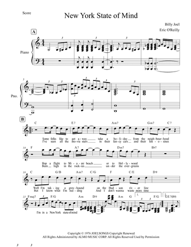 Choral Choir,Choral (SATB) - Level 3 - Digital Download SKU: A0.1294797 By Billy Joel. By Billy Joel. Arranged by Brad Rees. Blues,Jazz,Pop. 23 pages. TiffinMusic Publications #885139. Published by TiffinMusic Publications (A0.1294797). Arranged for the George Mason University Vocal Jazz Ensemble, and dedicated to Prof. Anthony Maiello in celebration of his career at GMU and as a conductor and music educator. In the style of the Tony Bennett & Billy Joel recording. Level III, SATB w Rhythm Section, optional space for vocal or instrumental improv solo. This product was created by a member of ArrangeMe, Hal Leonard’s global self-publishing community of independent composers, arrangers, and songwriters. ArrangeMe allows for the publication of unique arrangements of both popular titles and original compositions from a wide variety of voices and backgrounds. About Digital Downloads Digital Downloads are downloadable sheet music files that can be viewed directly on your computer, tablet or mobile device. Once you download your digital sheet music, you can view and print it at home, school, or anywhere you want to make music, and you don’t have to be connected to the internet. Just purchase, download and play! PLEASE NOTE: Your Digital Download will have a watermark at the bottom of each page that will include your name, purchase date and number of copies purchased. You are only authorized to print the number of copies that you have purchased. You may not digitally distribute or print more copies than purchased for use (i.e., you may not print or digitally distribute individual copies to friends or students).