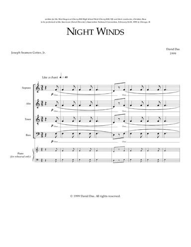 Choral Choir (SATB) - Digital Download SKU: A0.916076 Composed by David Das. 20th Century,A Cappella,Contemporary. Octavo. 5 pages. Records Room Music #6657781. Published by Records Room Music (A0.916076). A delicate tone poem for a cappella SATB choir divas. This is the first in the set of Two Poems of Joseph Seamon Cotter. Jr., the other being Rain Music which can also be heard at the same YouTube link. This product was created by a member of ArrangeMe, Hal Leonard’s global self-publishing community of independent composers, arrangers, and songwriters. ArrangeMe allows for the publication of unique arrangements of both popular titles and original compositions from a wide variety of voices and backgrounds. About Digital Downloads Digital Downloads are downloadable sheet music files that can be viewed directly on your computer, tablet or mobile device. Once you download your digital sheet music, you can view and print it at home, school, or anywhere you want to make music, and you don’t have to be connected to the internet. Just purchase, download and play! PLEASE NOTE: Your Digital Download will have a watermark at the bottom of each page that will include your name, purchase date and number of copies purchased. You are only authorized to print the number of copies that you have purchased. You may not digitally distribute or print more copies than purchased for use (i.e., you may not print or digitally distribute individual copies to friends or students).