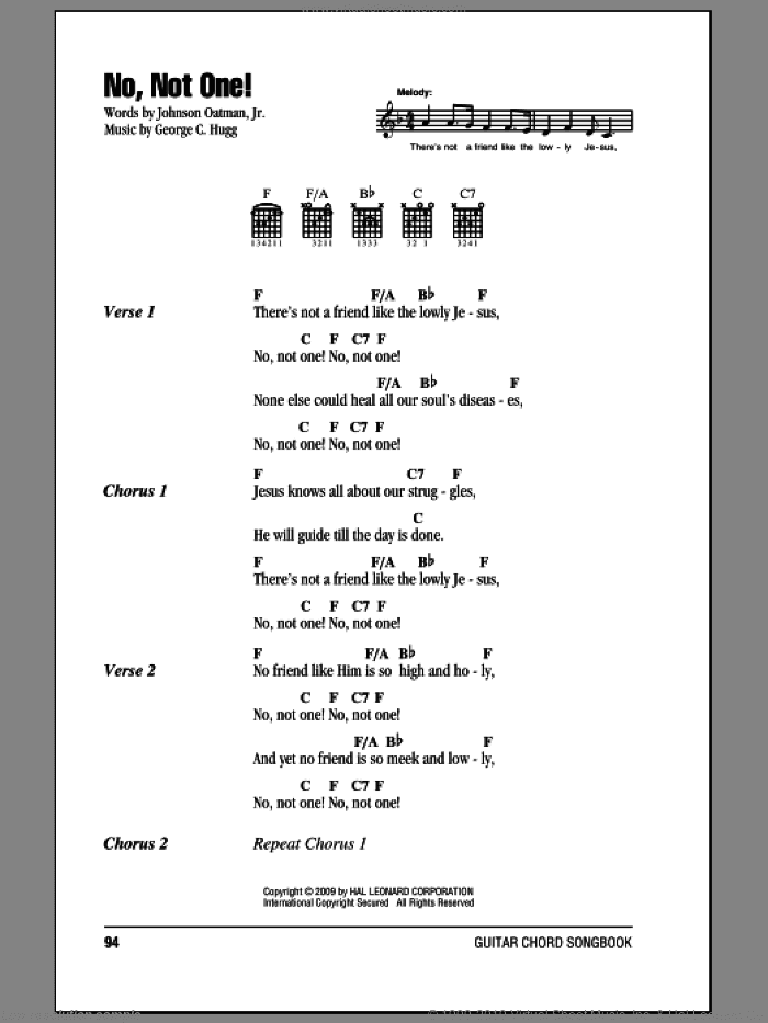 Digital sheet music for guitar (chords)NOTE: guitar chords only, lyrics and melody may be included (please, check the first page above before to buy this item to see what's included)Publisher: Hal LeonardContributors to this music title:George C. Hugg (writer)This item includes: PDF (digital sheet music to download and print)Instrumentation:guitar (chords)Skill Level:intermediateGenre:christian, gospelPages:2